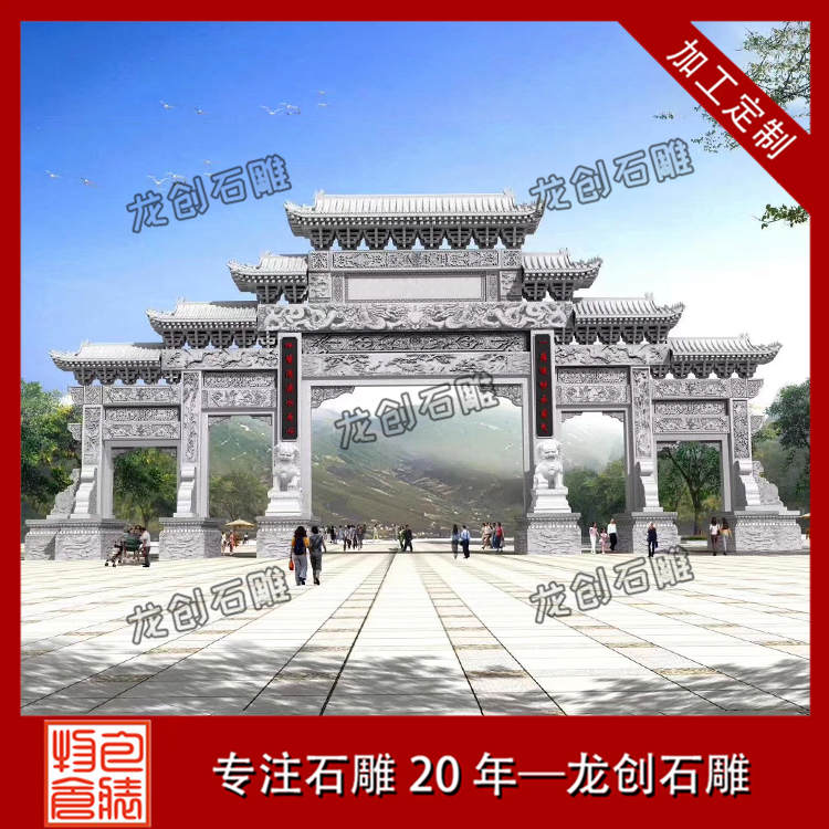 五門農村石牌樓:五門農村石牌樓是一座規模相對較大的農村石牌樓作品,然而在村莊里卻很少有五門農村石牌樓。因為五門牌坊寬度比較大很多村莊都不適合安置。不過五門石牌樓的設計需要整體規劃,其造型及樣式和工藝也將會更加的精致。由于五門石雕牌坊規模較大,在雕刻牌坊時需要注意一些細節。由于地域文化的不同牌坊雕刻本身也會有很大的差別。加入使用一些具有當地文化特色的元素會使這座農村石牌樓更加具藝術魅力。普通五門農村石牌樓價格在25萬以上,具體看客戶選擇的樣式。