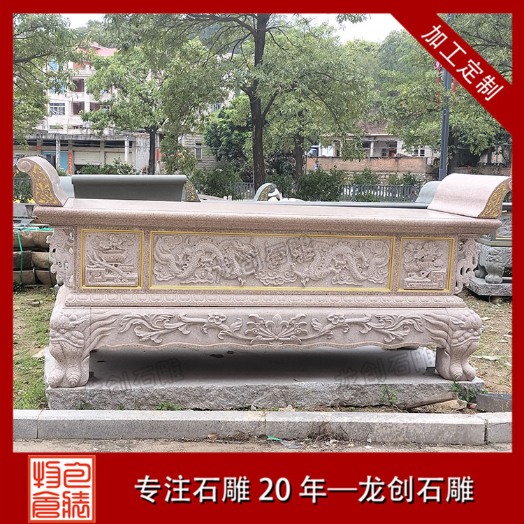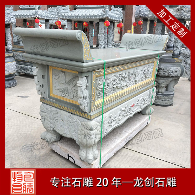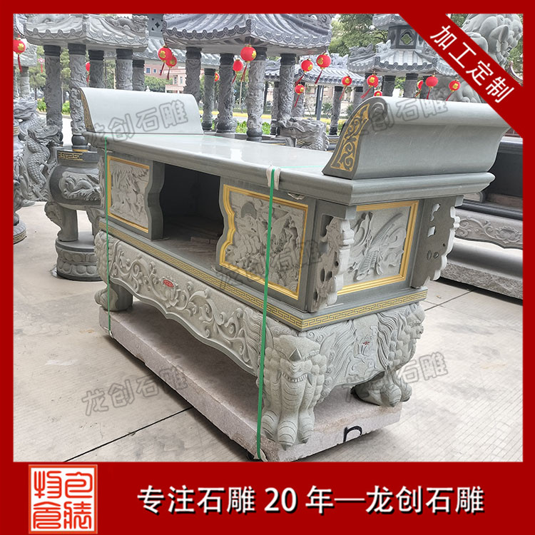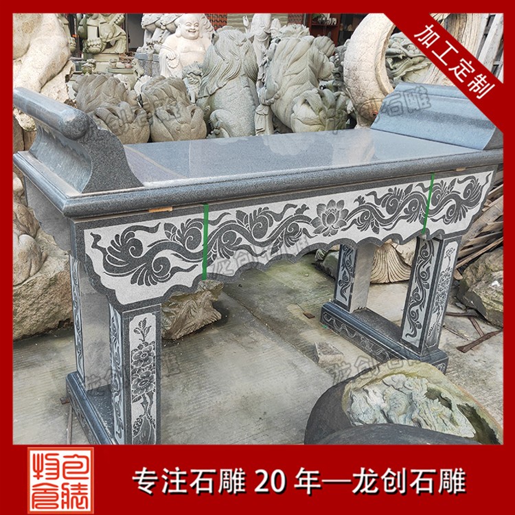 花崗巖:這是一種常見且優(yōu)質(zhì)的材質(zhì)選擇。花崗巖質(zhì)地堅硬,密度高,具有很強(qiáng)的抗壓性和耐磨性。其顏色豐富,如芝麻白、芝麻黑等,不同顏色的花崗巖可以營造出不同的視覺效果。而且花崗巖能夠很好地抵御戶外環(huán)境的侵蝕,適合放置在寺廟、祠堂等露天場所的石雕供桌。