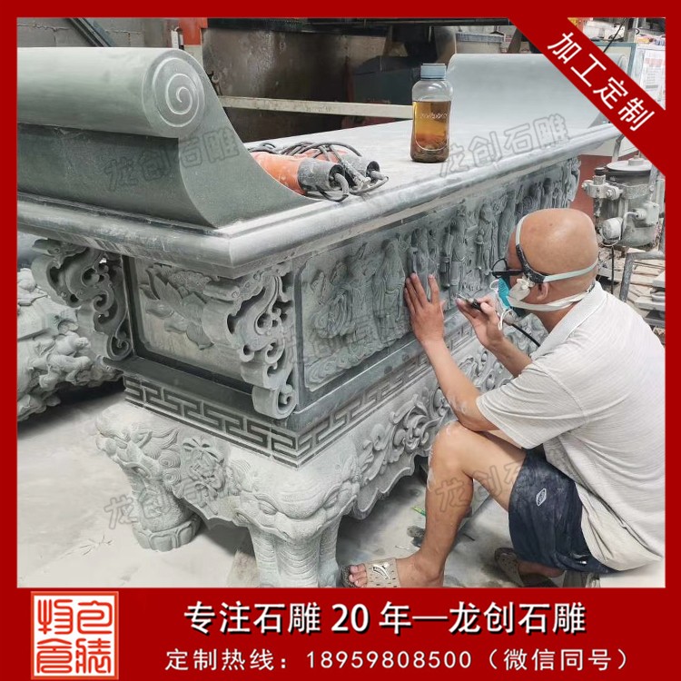 手工與機(jī)械結(jié)合:在現(xiàn)代石雕供桌的制作過程中,通常是手工與機(jī)械相結(jié)合的方式。機(jī)械加工可以完成一些基礎(chǔ)的切割、打磨等工作,提高生產(chǎn)效率。而關(guān)鍵的雕刻環(huán)節(jié)則依賴于經(jīng)驗豐富的工匠手工完成,他們憑借精湛的技藝和對傳統(tǒng)文化的理解,將靈魂注入到每一個雕刻細(xì)節(jié)中,確保供桌的藝術(shù)品質(zhì)。