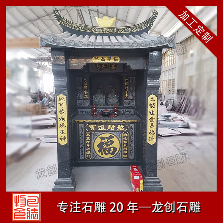 在浙江寧波的金蓮寺改造項目中,一座精美的石雕土地廟成為點睛之筆。這座土地廟采用優質芝麻黑654石材,質地堅硬,色澤溫潤。廟身的雕刻工藝精湛絕倫,高2.9米,寬1.36米,深度1.63米,整體造型古樸典雅,遵循傳統廟宇建筑風格,飛檐斗拱線條流暢,比例協調;墻體厚實,雕紋精美,線條流暢。其內部空間布局合理,土地神像安置其中,更顯威嚴。