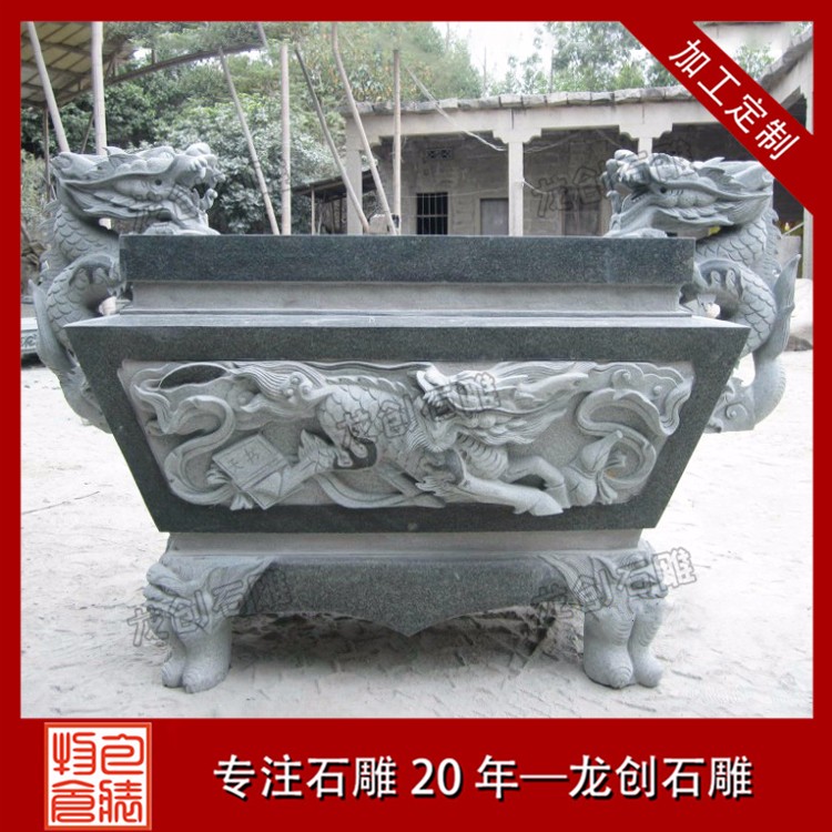 惠安長(zhǎng)方形石雕香爐采用優(yōu)質(zhì)花崗巖精雕細(xì)琢而成,用以盛載香支,以作日常供奉神明之用。香爐上面的門(mén)主要作用是起到空氣流通和清理香灰的作用。開(kāi)六個(gè)門(mén)主要是怕刮風(fēng),這樣就是有風(fēng),煙也會(huì)隨風(fēng)飄走。而我們?cè)谒略褐卸嘁?jiàn)于圓形的和長(zhǎng)方形的香爐,圓形香爐都有三足,一足在前,兩足在后,長(zhǎng)方形香爐一般是四足,是如法的放置;常以之譬喻佛教中的三寶,缺一不可。