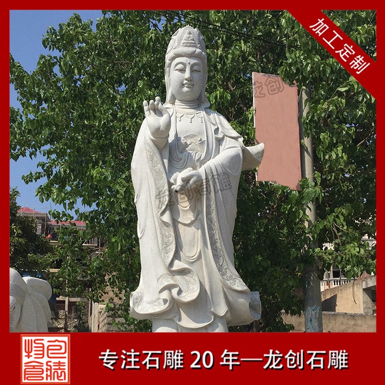 在現代石材市場中,將石材根據其形成的方式不同區分為花崗巖、大理石、砂巖等。在滴水觀音佛像雕塑的所用石材中,這三種石材都是可以作為雕塑用材的,但是常用的石材并沒有很多。以福建石雕滴水觀音佛像為例,目前這里制作滴水觀音的主要石材為部分花崗巖石材和漢白玉。這些所說的花崗巖石材有芝麻白花崗巖、芝麻灰花崗巖、青石、桃花紅、泉州白。其中以湖北633#石材制作滴水觀音為美觀,也是價格相對較高的。采用這種石材制作出的滴水觀音外表顆粒細膩,身體紋路清晰自然,遠處觀看又像是白色雕像,整體制作出來的石雕滴水觀音十分干凈整潔。