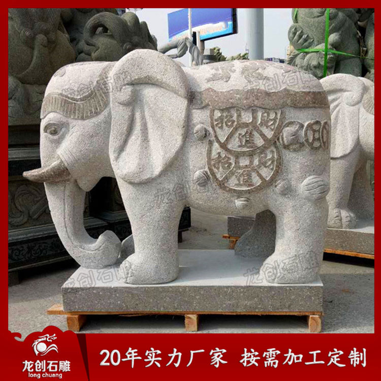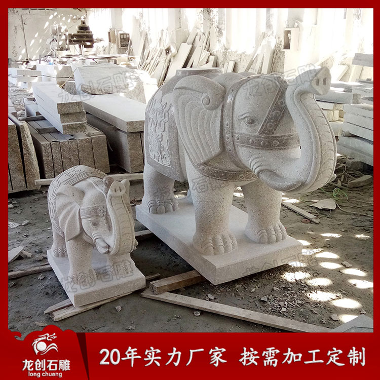 石雕大象造型各異,從鼻子來看,就有分鼻子朝上、鼻子朝下、鼻子朝內、鼻子朝外。象諧“祥”音,所以常有吉象之稱,適合擺放在酒店別墅、企業、寺廟門口等各種場景。