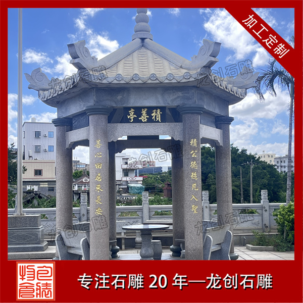 從工藝構造來看,標準六角涼亭包含臺基、柱礎、檐柱、梁枋、屋面、寶頂六大組成部分。臺基常采用須彌座樣式增強穩定感;六根檐柱通過精確的榫卯結構與梁枋連接;屋面由六塊梯形石板精準拼接形成流暢的排水斜面;頂部寶頂作為收束構件兼具裝飾功能。雕刻工藝以淺浮雕為主,常在柱礎處飾以蓮紋,欄板處刻有簡化的幾何紋樣或自然圖案,保持整體風格的協調統一。