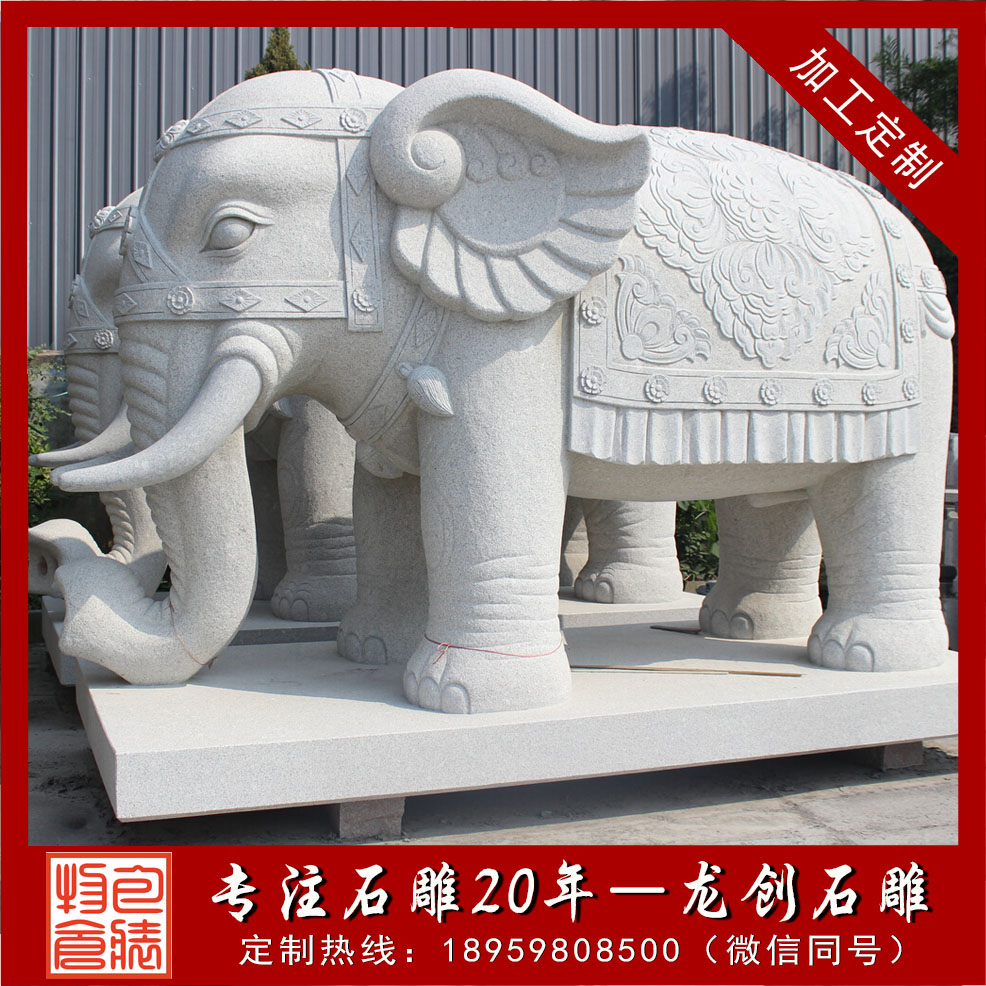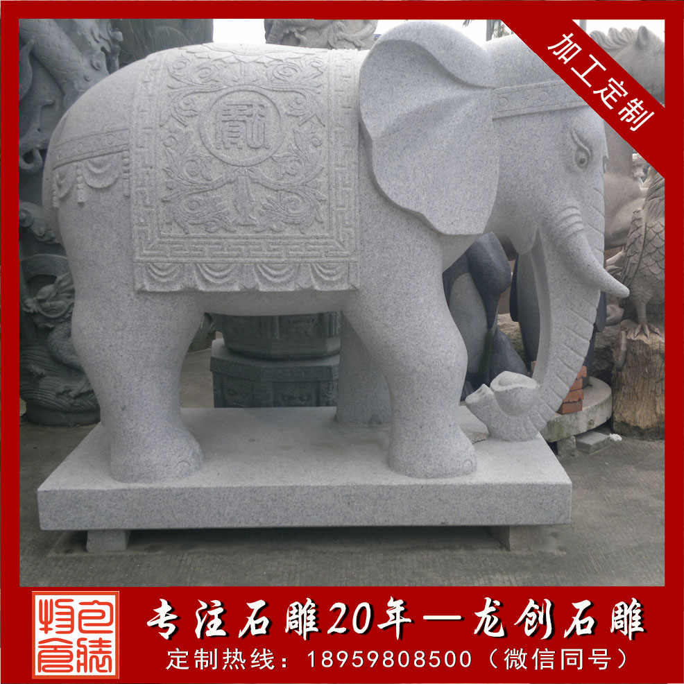 在家中擺放石雕象并不是什么時候都可以的事情,也有一個日期時間上的要求,其本身是一種風水動物,根據不同地區的風俗要求,在擺放上也都會有不同的要求。在實際擺放的時候就要先做好整體考慮,根據當地的風俗習慣等來對比,選擇到合適的吉日擺放,根據一些地域的特殊要求,擺放也都會需要挑選合適時期下圖是我們嘉祥縣長城石雕廠制作的招財石雕大象,石材芝麻白花崗巖,大象背上托的是元寶,適合擺放在公司、家庭、別墅大門口,我們還制作過寺院大象,他雕刻圖案一般是寶相紋,大象背上馱著蓮花、經書等佛教寶物。