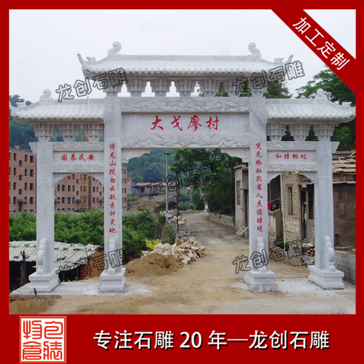 石牌樓是我國建筑中的藝術代表,集中展示了我國雕刻文化,也能夠探索到不同歷史時期的故事。石牌樓如今建造應用多,尤其在新農村村口石牌樓設計制作及選購中,因為修建石牌樓是為了彰顯新農村面貌,不少新農村建設也都會作為重點設計考慮。那么新農村村口石牌樓設計制作及選購有哪些注意事項? 下面由村口石牌樓廠家龍創石雕為大家介紹。