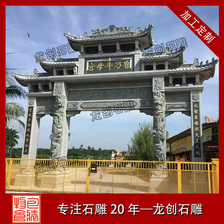 牌坊上經(jīng)??吹礁〉颀?jiān)谥袊膫鹘y(tǒng)文化中是吉祥的象征,龍?jiān)谠浦邪肯?,將?yōu)美的姿態(tài)展現(xiàn)給世人看,線條流暢;寓意龍龍四海,還有石獅子抱鼓石有鎮(zhèn)宅等作用,花鳥、圖案、龍鳳及各種瑞獸等都有祥瑞之意,修建這樣的石雕牌坊大門,更能令村莊吉祥如意。龍創(chuàng)石雕專注牌坊制作20年,堅(jiān)守工匠本心,將每一座牌坊制作都追求優(yōu)質(zhì)。